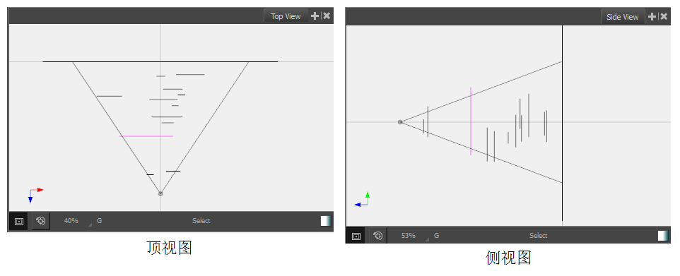 - 侧视图:显示图层和对象在前后 (Z) 轴和南北 (Y) 轴上的位置。