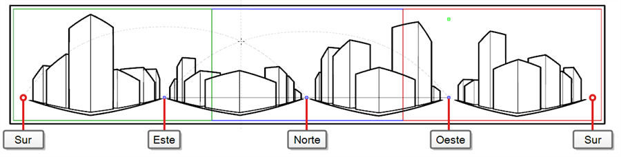 Esta guía utiliza 5 puntos de desaparición. Cuando dibuja una línea horizontal, se curva formando un arco sobre uno de los puntos de desaparición y llegando hasta los dos puntos de desaparición circundantes. Esto crea un efecto de perspectiva donde cada punto de desaparición representa uno de los puntos cardinales, salvo los puntos más a la izquierda y más a la derecha que representan el mismo punto cardinal, lo que crea un fondo en bucle. Los fondos creados con la guía de perspectiva continua con 4 puntos se pueden repetir en bucle horizontalmente para simular una rotación completa de la cámara en el eje y.