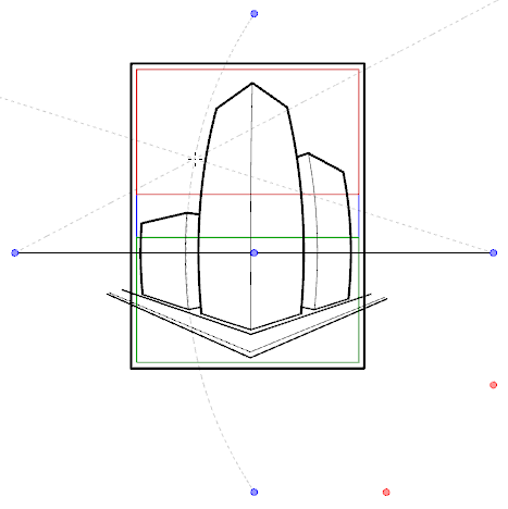 Cuando se agrega una guía nueva, su línea de horizonte se configura en una posición y un ángulo predefinidos y sus puntos de desaparición se configuran en una posición predefinida. En muchos casos, debe realizar ajustes en la guía para poder dibujar fondos y objetos desde el punto de vista correcto.