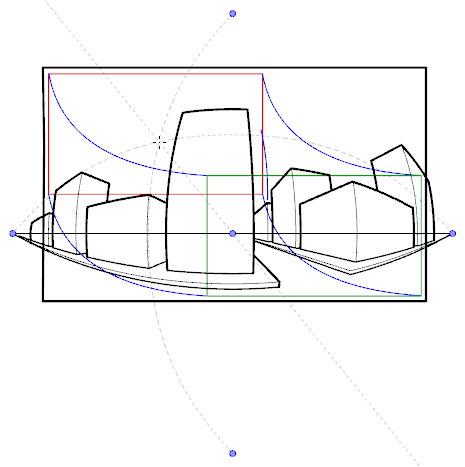 • La guía de perspectiva con 3 puntos (paneo vertical) le ayuda a dibujar fondos panorámicos verticales, con líneas verticales curvilíneas. Un punto de desaparición se coloca en el centro de la línea de horizonte para ayudarle a dibujar líneas en el eje z y dos puntos de desaparición se colocan debajo de la línea de horizonte, fuera del campo de la cámara, para definir la curva de las líneas verticales. Las líneas horizontales se colocan en paralelo a la línea de horizonte.