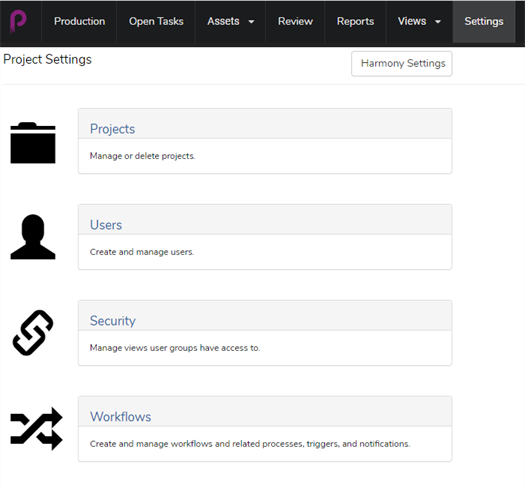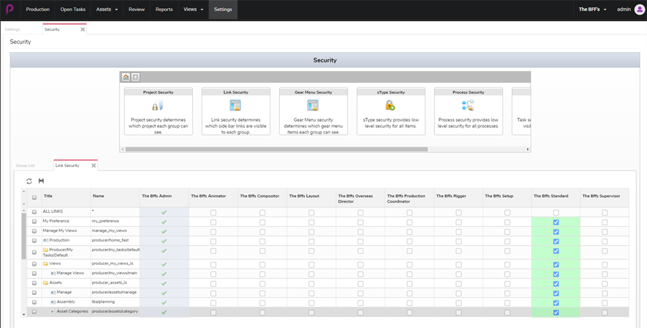 La sección Security (Seguridad) permite al usuario administrador establecer permisos para grupos, acceso a páginas, acceso a proyectos, acceso a tareas y acceso a opciones de menú, como crear, borrar o archivar.