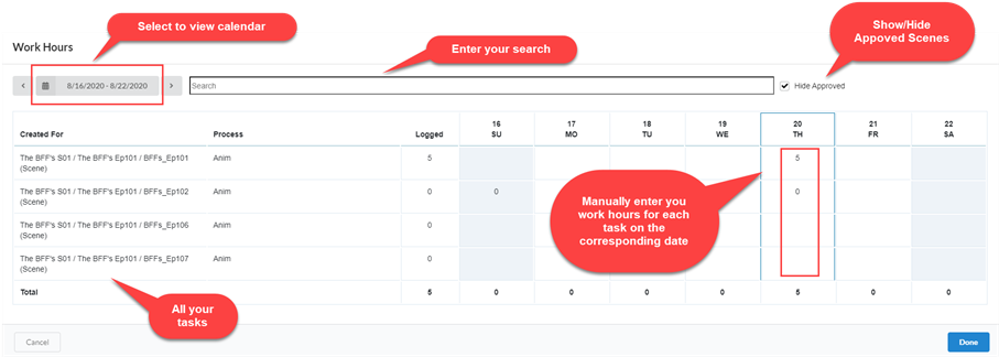 Producer permite a los usuarios supervisar el trabajo por horas. En la vista Open Tasks (Tareas abiertas), el usuario puede registrar las horas trabajadas en cada tarea en fechas específicas.