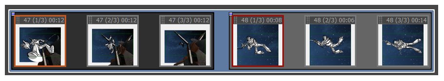 - En la vista de imágenes en miniatura o de línea de tiempo, seleccione todas las escenas que desee colocar en una nueva secuencia. Para ello, mantenga pulsada la tecla Mayús y haga clic en la primera escena que debe formar parte de la nueva secuencia y, a continuación, haga clic en la última escena con el mismo propósito. Con esta acción se seleccionan todas las escenas situadas entre las que ha hecho clic.