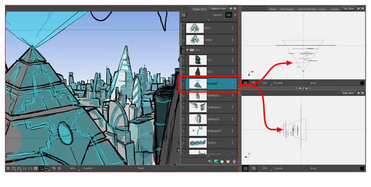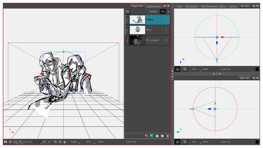 Storyboard Pro le permite manipular capas de dibujo en el espacio 3D, así como integrar modelos 3D en el storyboard. Si el proyecto cuenta con modelos 3D, puede importarlos en el proyecto y, a continuación, insertarlos en los paneles en lugar de tener que dibujarlos.