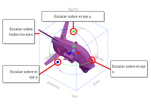 Si selecciona un modelo 3D con la herramienta Layer Transform (Transformación de capa), aparece un manipulador de transformación 3D sobre él en las vistas de escena, de cámara, superior y lateral. El manipulador de transformación para modelos 3D es un cubo con controles en su interior que sirven para mover, rotar y escalar el modelo en cualquiera de los tres ejes.