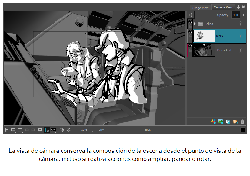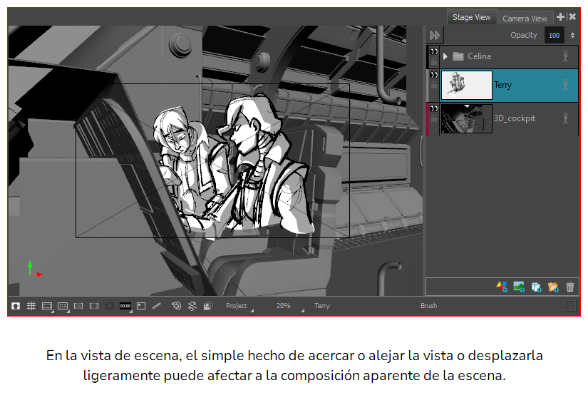 En Storyboard Pro, la vista de escena es la vista predeterminada en la que se dibujan y manipulan los objetos. Sin embargo, cuando se trabaja en 3D, tiene un inconveniente: al desplazar, girar, acercar o alejar la vista de escena, se cambia el punto de vista desde el que se ve el ambiente. De este modo, la posición y el tamaño aparentes de los elementos pueden no ser representativos de lo que aparece después en el storyboard o en la animática.