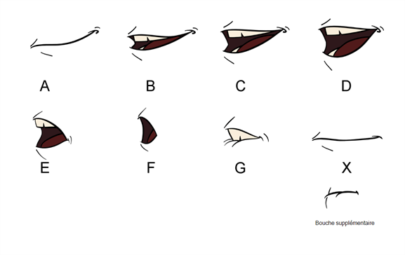 To solve this problem, Harmony provides an automatic lip-sync detection feature. This feature analyzes the content of a sound track in your scene and associates each phoneme it detects with one of the mouth shapes in the following mouth chart, which is a standard mouth chart in the animation industry.