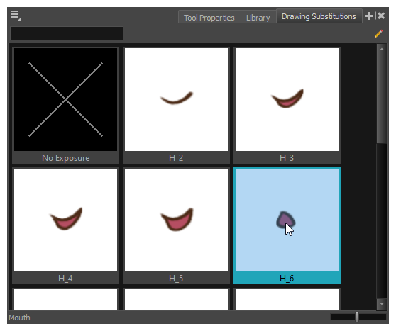 - In the Drawing Substitution window of the Library view, drag the slider to choose a mouth shape. The current drawing is swapped for the one in the preview window.
