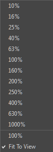 This field displays the current zoom level in the Perspective view. You can use the Zoom level drop-down menu to select a specific zoom level from the list. Zoom levels from 2.5% to 6400% are available; you can also select Fit To View to automatically use a zoom level that lets you see all your scene layers and information in the Perspective view at once.