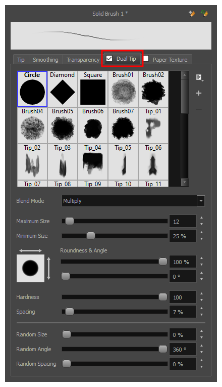 NOTE To use a Dual Tip, you must enable option by checking the checkbox inside the Dual Tip tab. Additionally, if you are working on a vector layer, the Brush Type option of the Tip tab must be set to Textured Vector Brush.