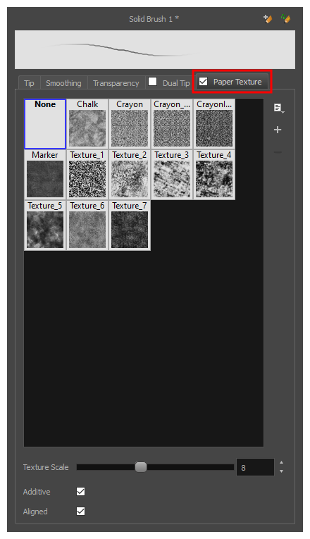 The Paper Texture tab lets you configure a paper-like texture for your brush. You can also add textures by importing image files, or import paper textures that were previously exported from Harmony.