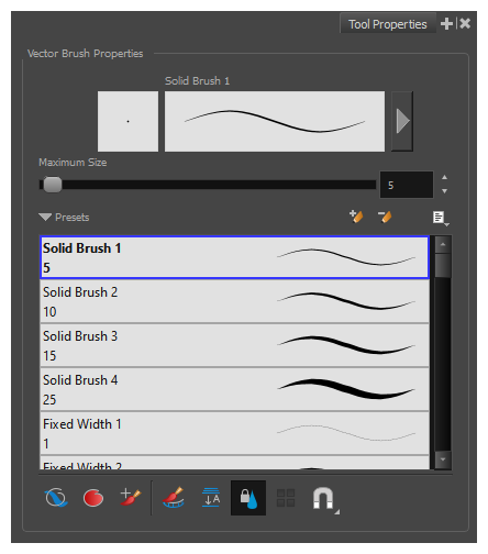 By default, Harmony has preloaded brush presets. You can also create your own brush presets by configuring your brush, then saving its properties into a new preset. It is also possible to export and import brush presets.