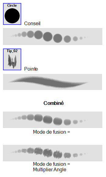 This is the default blend mode. When the two brush tips are combined in this mode, they essentially cut each other out in overlapping areas, where one or both tips have an area of 100% transparency. The less opaque the brush tips are, the lighter their combination.