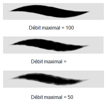 The Maximum and Minimum Flow parameters let you set the range for the rate at which paint flows from your brush. The analogy works better with a pen. The greater the flow, the more ink comes out, hence the more consistent the colour and texture of the line. If the flow is light, then the colour and texture of the line may look spotty. This feature works with the pressure sensitivity of a pen tablet.