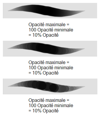 • Minimum Opacity: Sets the transparency limit of the brush mark when the pressure is very light. It is defined as a percentage of the Maximum Opacity value. If the Minimum Opacity value is set to 100%, then tablet pressure sensitivity will no longer be applicable. The opacity will be set to the constant rate of the Maximum Opacity value.