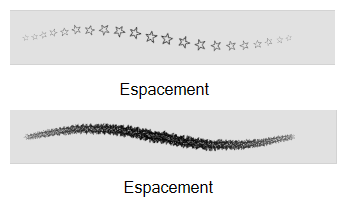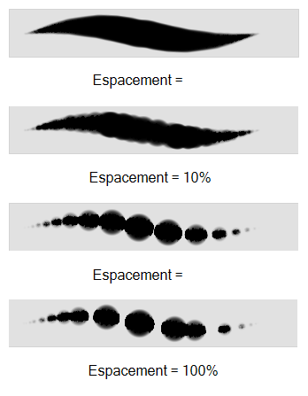 Defines the amount of space between each stamp of the brush. A value of 100% sets the stamp marks edge to edge, if there is no white space around the shape. The larger the value, the greater the space between marks. A really large value can make the brush stroke appear as a string of individual marks. Conversely, a small spacing value will give the appearance of a fluid brush stroke.