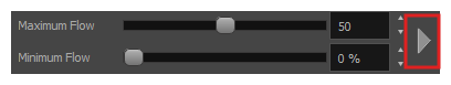 • Minimum Flow: Sets the minimum rate at which colour and texture are applied as you create a fluid stroke. It is defined as a percentage of the Maximum Flow value. If the Minimum Flow value is set to 100%, then tablet pressure sensitivity will no longer be applicable. The flow will be set to the constant rate of the Maximum Flow value.