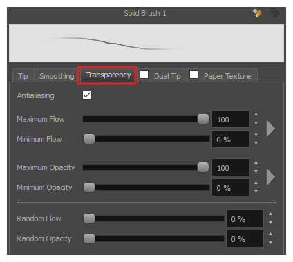 The Transparency tab allows you to decide if your brush has antialiasing as well as to set its flow and opacity settings.