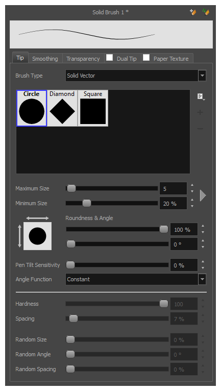 NOTE The Transparency tab's options are only available on vector layers if the Brush Type option of the Tip tab is set to Textured Vector Brush. On bitmap layers, those options are always available.