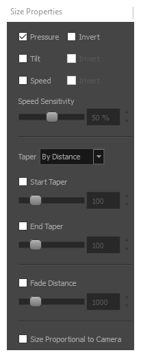 • Speed: Allows you to reduce the size of the stroke by drawing at a fast speed. You can check the box to invert this behaviour.