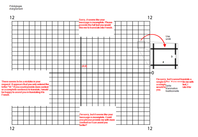 The default Alignment setting in Harmony is based on such a traditional 4:3 drawing grid. In a scene with an aspect ratio of 4:3, this means that positioning an element 12 fields in any direction will make it reach one of the edges of the camera field. For example, 12 North is the vertical position of the upper edge of the camera field, and 12 East is the horizontal position of the right edge of the camera field.