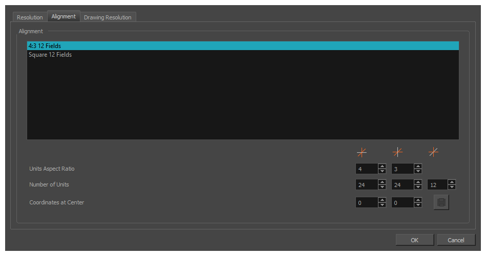 - 4:3 12 Fields: Defines the units of your project to have a 4:3 ratio and sets up 12 of these units to run both vertically and horizontally in four cardinal quarters (NW, NE, SW, SE). This is the default setting, and it corresponds to an animation grid used in traditional animation. Hence, coordinates based on a traditional animation grid can be entered in Harmony as is to position elements where they are expected to be.