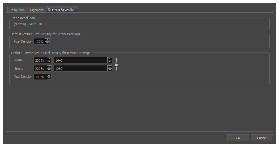 These settings are applied to newly created drawings in the scene, but not to existing drawings in your scene. To change the pixel density of existing vector drawings, you must select Drawing > Change Vector Drawing Brush Resolution from the top menu. To change the pixel density and canvas size of existing bitmap drawings, you must select Drawing > Change Bitmap Drawing Resolution from the top menu.