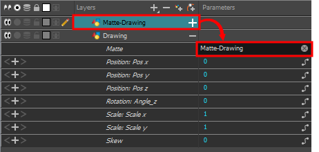 Optionally, you can connect a matte drawing to a drawing layer. When a drawing layer has a matte drawing, only the parts of the drawings that intersect with the opaque areas of the matte drawing will be rendered. This allows you to accomplish the same effect as connecting the drawing layer to a cutter effect.