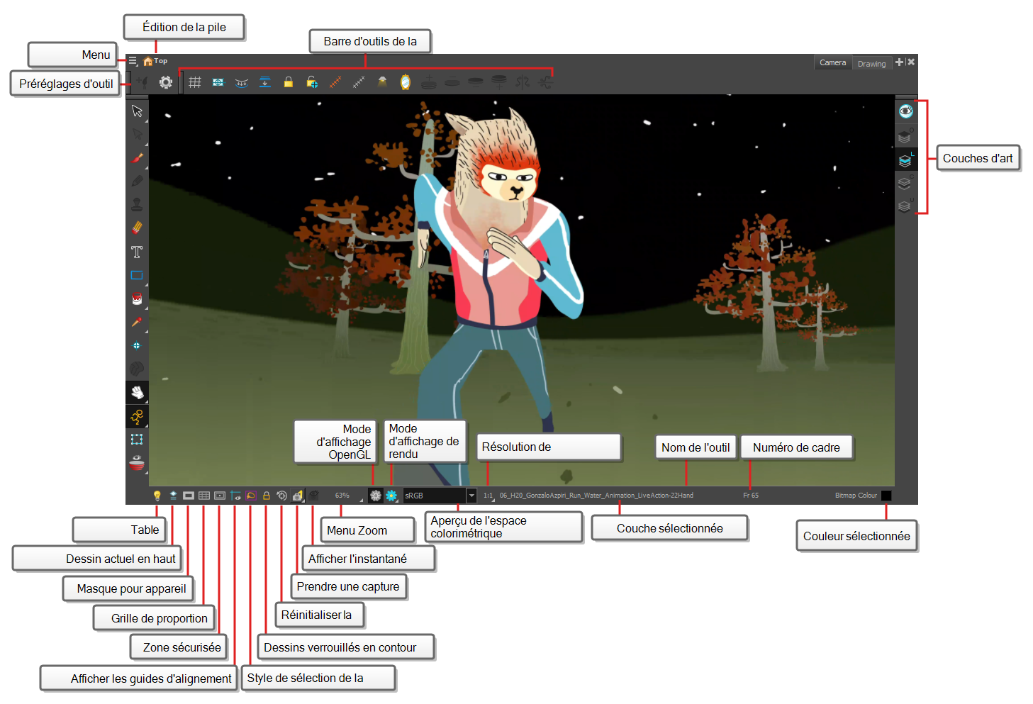 The Camera view is the centre of operations in Harmony. In this view, you can draw, paint, animate, set up your scene, manipulate objects, open symbols and preview your animation.