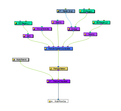 Allows you to apply a random effect to the particle system. There may be times when you want to copy the particle system to two different locations on your screen. You can take the out-port of the Particle System Composite node, and plug this into two separate Bakers and Visualizers. Then you could move one system over by attaching a peg into the left side of one Visualizer. This makes the two systems look exactly the same. Add a random Seed to make them look different. |