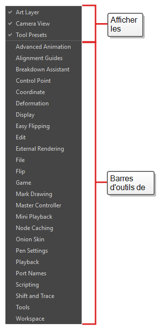 In the list of toolbars in the contextual menu of a view, the toolbars listed above the separator are workspace toolbars, and the ones below the separator are view toolbars.