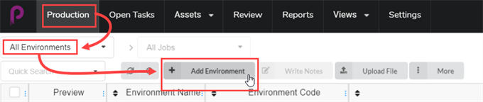 - Dans la barre d’outils de l’onglet Production, cliquez sur le bouton Ajouter un environnement.
