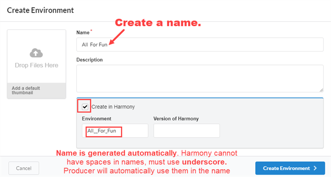- Cliquez dans le champ Environnement. Le nom de l’environnement est automatiquement régénéré. S’il y a des espaces dans le nom, ils seront automatiquement remplacés par des traits de soulignement. Harmony n’autorise pas les espaces dans les noms.