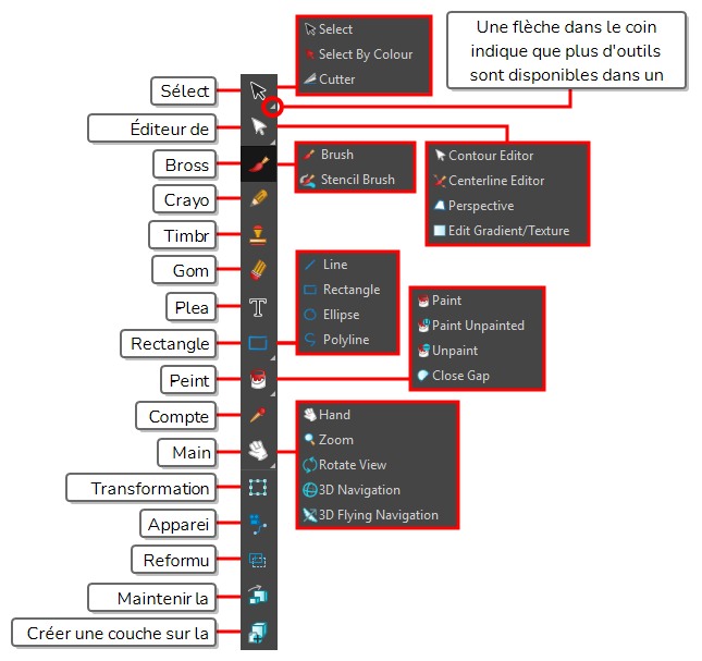 The Tools toolbar contains the main tools you need to work in Storyboard Pro. In the default workspace, this toolbar located on the left edge of the application window.