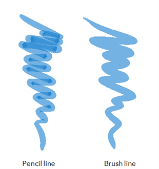 The Brush and Pencil tools are used for drawing and sketching. Both tools support pressure sensitivity, allowing you to create lines with variable thickness. The Brush tool produces contour vector lines. The Pencil and shape tools produce central vector lines. This means that a pencil line’s control points (used to deform its shape) are located along the length of the central spine, while the Brush line’s control points are located along the contour.