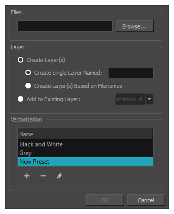 - Add to Existing Layer: Imports the images into the specified layer. Note that you can only import into layers that are compatible with your import options. For example, if you're importing images as vector drawings, you can only import them into vector drawing layers.