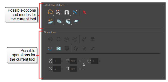 For example, if you choose the Select tool, the Tool Properties view will display the options and operations related to it, such as Snap to Contour, Apply to All Drawings, Flip Horizontal, and Flatten.