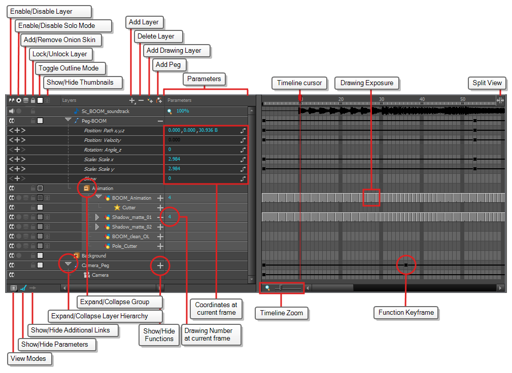 The Timeline view is the main view used when adjusting the timing of drawings, adding keyframes and ordering layers. The Timeline view displays layers, effects, sounds, keyframe values, scene length, layer names, drawings, keyframes, timing, and frames.
