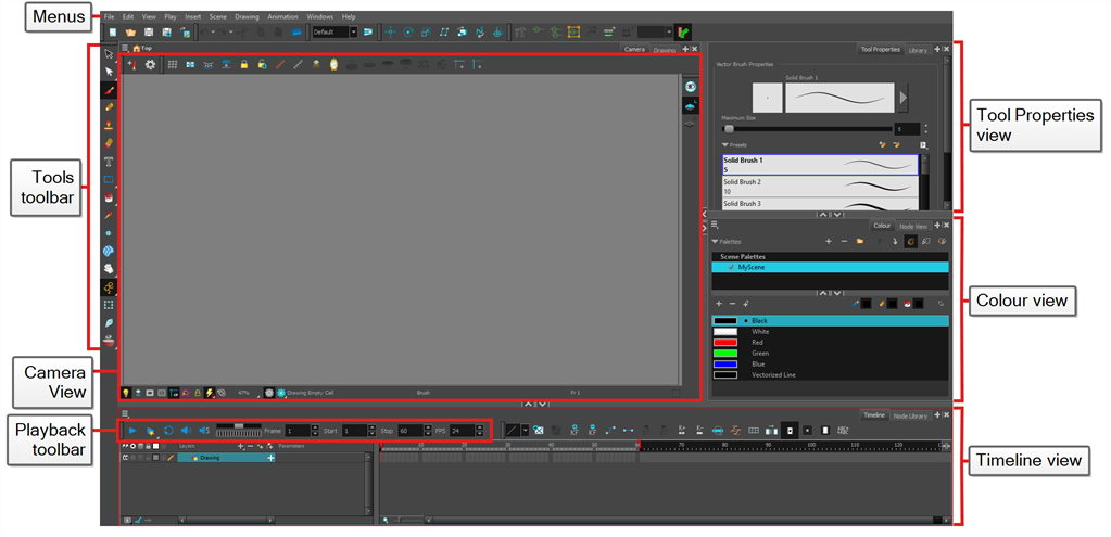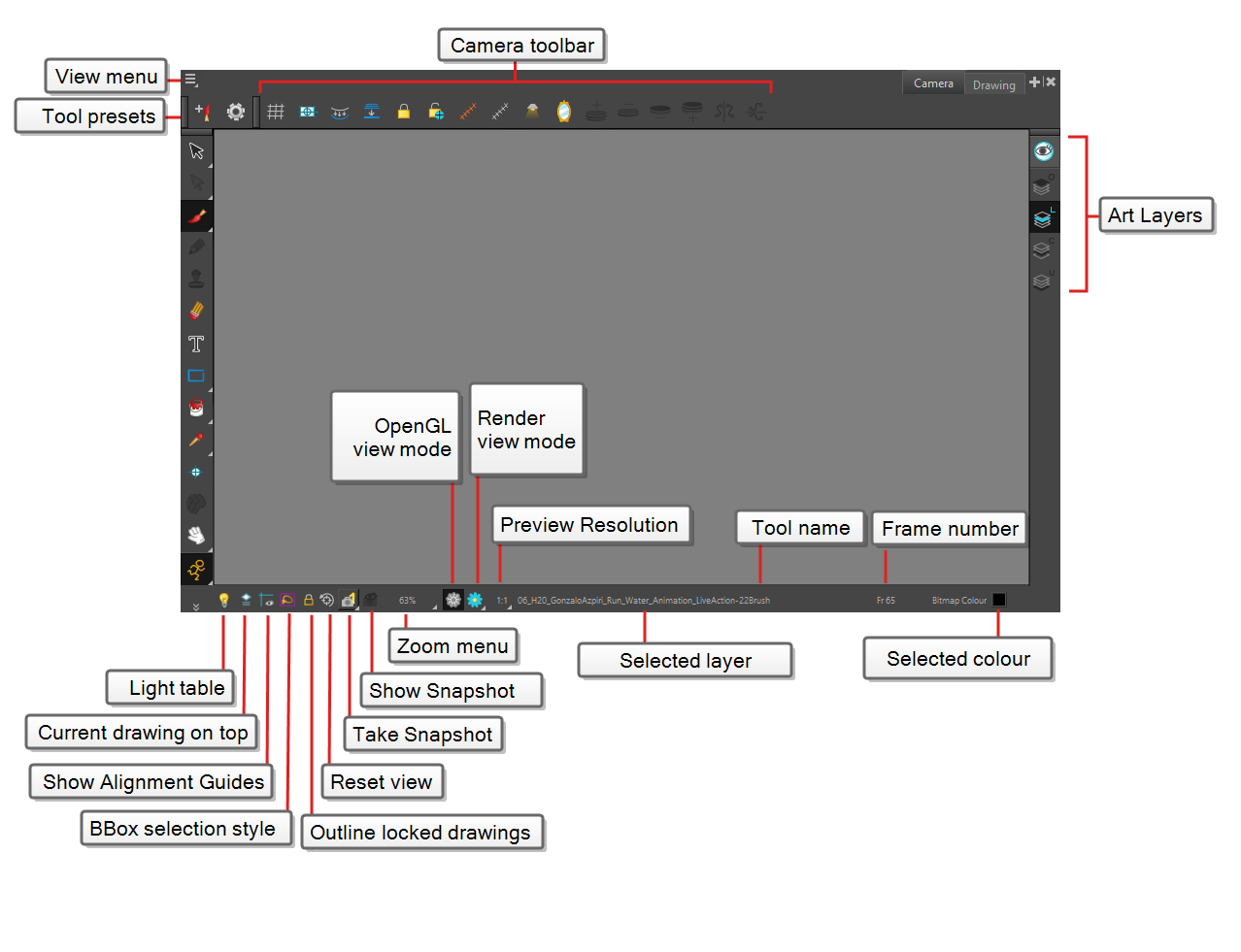 The Camera view is the centre of operations in Asset Editor. In this view, you can draw, paint, animate, set up your scene, manipulate objects, open symbols and preview your animation.
