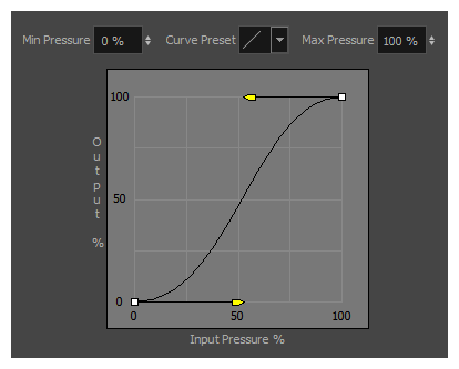 Game Storyboard allows you to customize the way it processes the pressure you put on your tablet pen into the thickness of your drawing strokes. You can do this by tweaking the pressure curve in the Pen Pressure Feel dialog.