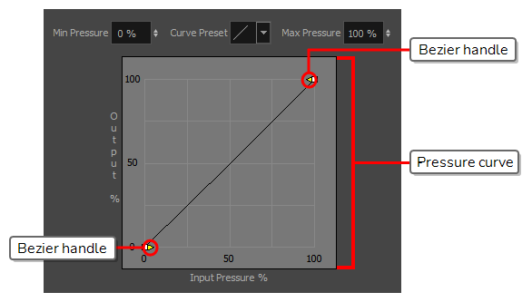 This curve determines how to process the amount of pressure you apply to your tablet pen into your drawing tool's size. By default, it is linear, meaning that the amount of pressure you put on your tablet pen is directly applied to the size of your drawing tool. By moving the two Bezier handles between the extremities of the curve, you can change the curve's shape.