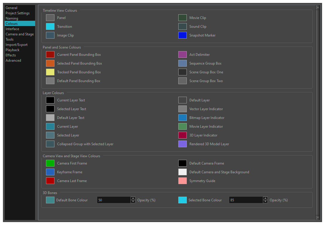 | 3D Bones | The colours and opacity level used for Bones in 3D elements. |