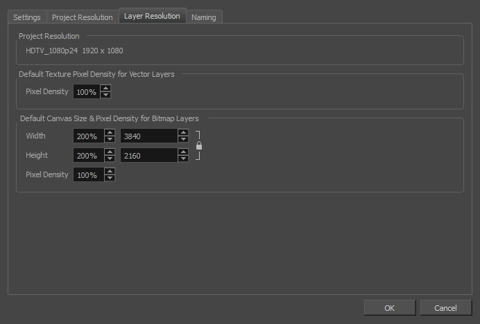 Lets you define the project resolution. Your project resolution should match the format of the production for which you are creating the storyboard. |