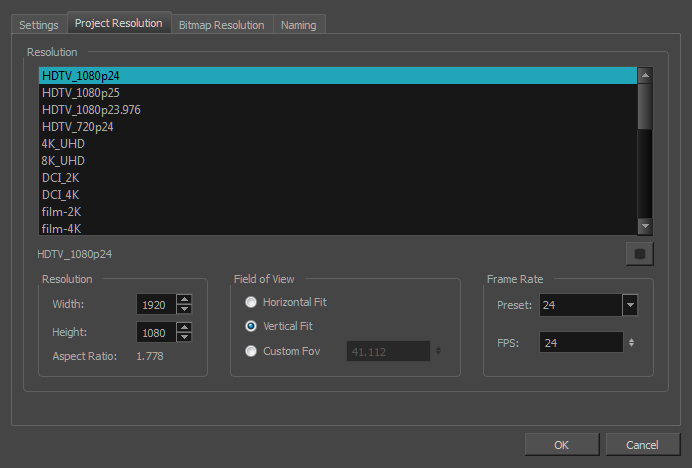 HDTV_Vertical: The "vertical resolution" of HDTV_Vertical refers to how the drawing grid is fit into the camera frame. When working with 12 or 16 field drawing grids, the grid is a different aspect ratio from the camera frame. When you fit vertically, you fit the grid with the top and bottom of the camera frame. NOTE The HDTV_Vertical format is ideal when importing images into an HD project.