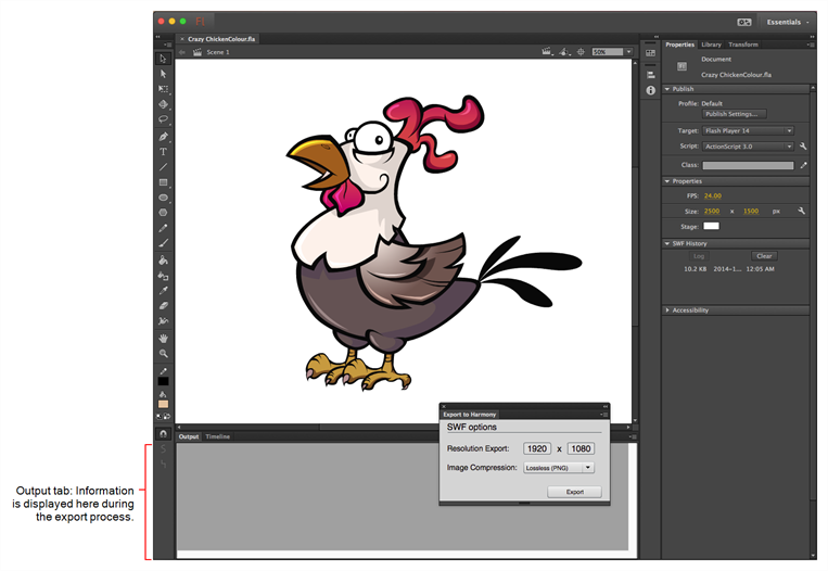 .txt files contain the drawing substitution information and at which frame they are exposed. A .swf file is created for each symbol in Flash and a .tpl file is created of them. The corresponding export.json file is also created, which you will need when importing your Flash scene in Harmony. These files are in a folder located at the same location as the.fla file. The folder name is the same as the .fla file.