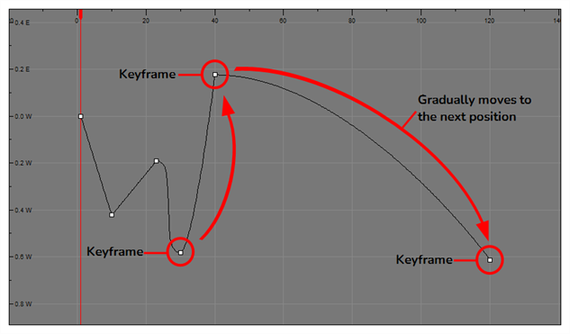 With motion keyframes, Harmony generates the interpolation between the motion keyframe and the next keyframe. This means that a value for each frame between the keyframes is calculated by Harmony to progress from the value of the previous keyframe to the value of the next keyframe.