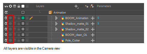 • Single-clicking a layer's colour swatch toggles Outline mode on or off. Outline mode makes the layer display as nothing but the outlines of its vector shapes in the Camera view, allowing you to see the drawing's shape without it blocking the view of layers behind it.
