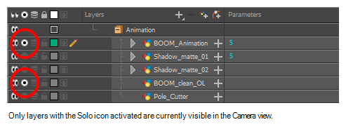 Solo mode allows you to only view specific layers in the Camera view and hide all others. When solo mode is enabled on one layer, only this layer will be visible. If solo mode is enabled on several layers, and only these layers will be visible. If solo mode is not enabled on any layer, all enabled layers will be visible.