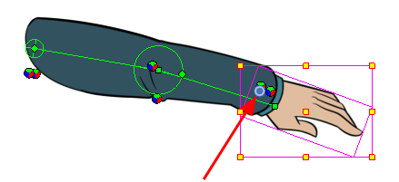 You will probably want to be able to manipulate and offset the parts of a rig that are connected to a Kinematic Output node. In this case, you can connect a peg between the Kinematic Output node and the drawing. It is especially important to set the pivot point of these drawings so that the animator can rotate and scale them without issue. For more information, see Setting Permanent Pivots.