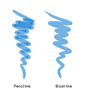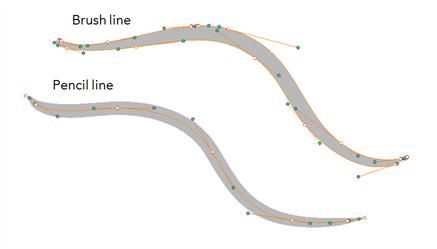 The Brush and Pencil tools are used for drawing and sketching. Both tools support pressure sensitivity, allowing you to create lines with variable thickness. The Brush tool produces contour vector lines. The Pencil and shape tools produce central vector lines. This means that a pencil line’s control points (used to deform its shape) are located along the length of the central spine, while the Brush line’s control points are located along the contour.